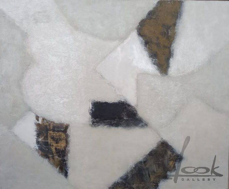 На сером фоне изображены многочисленные темные, белые и серые геометрические фигуры неправильной формы. На обороте надпись: Рустам Хальфин «Фрагмент» 1992 г., 50х60 см.